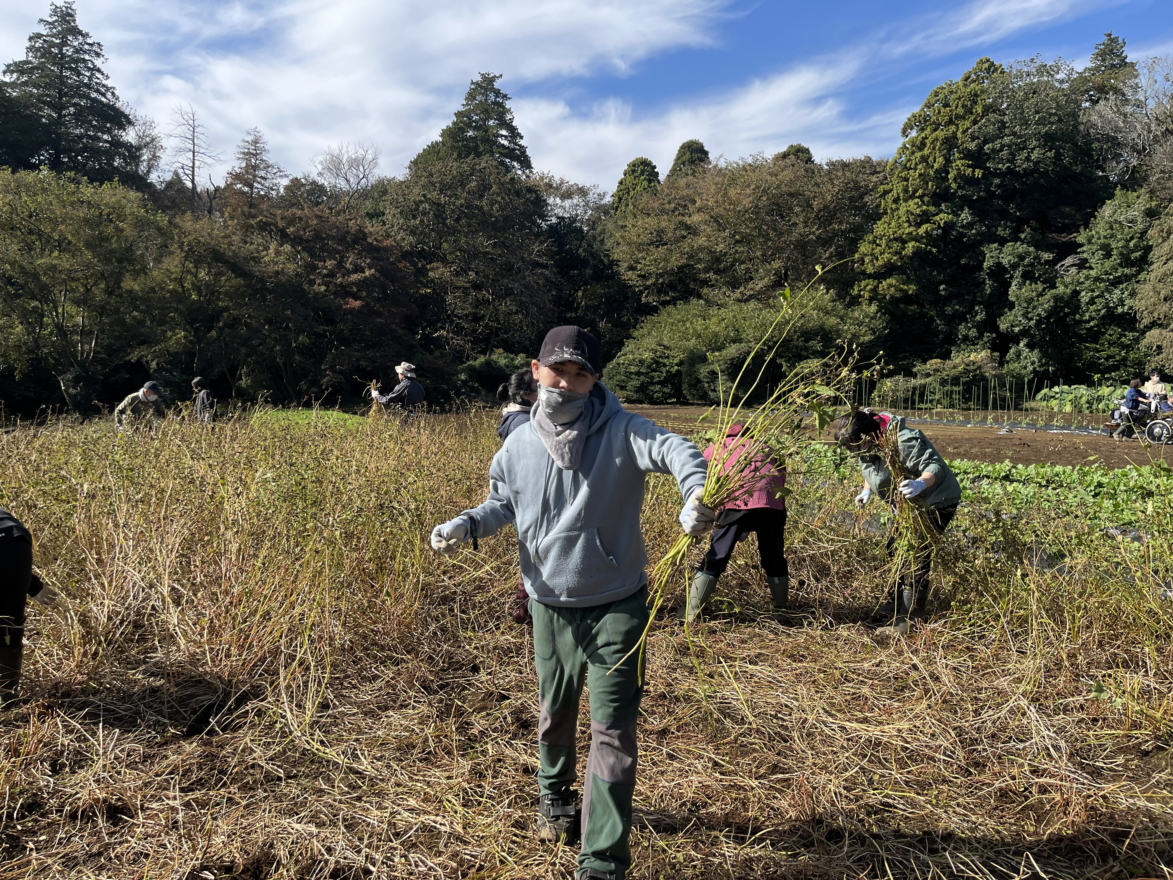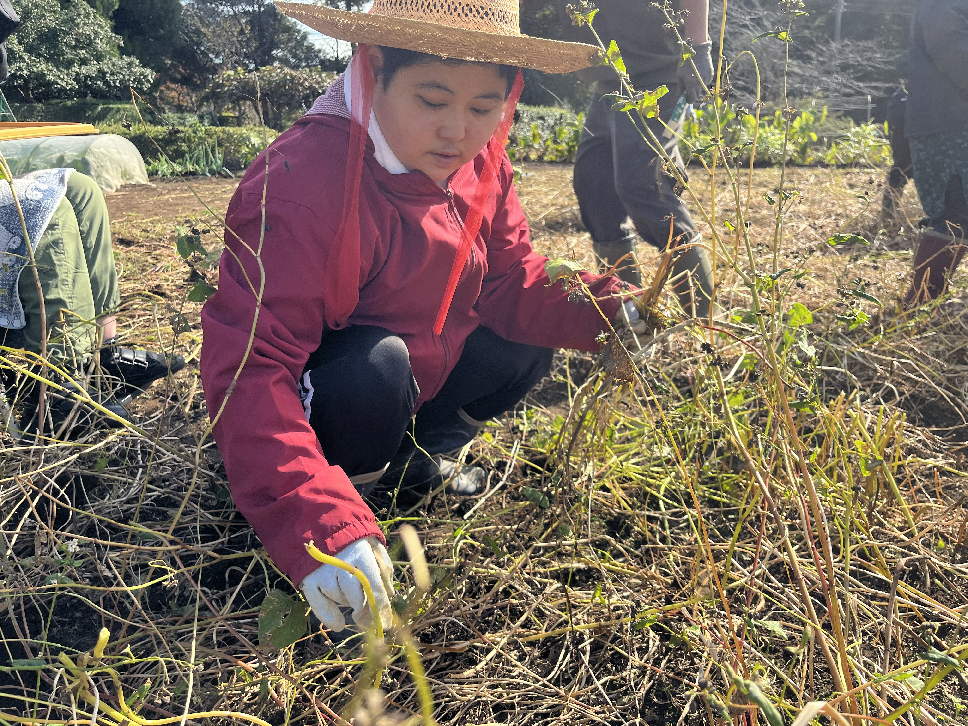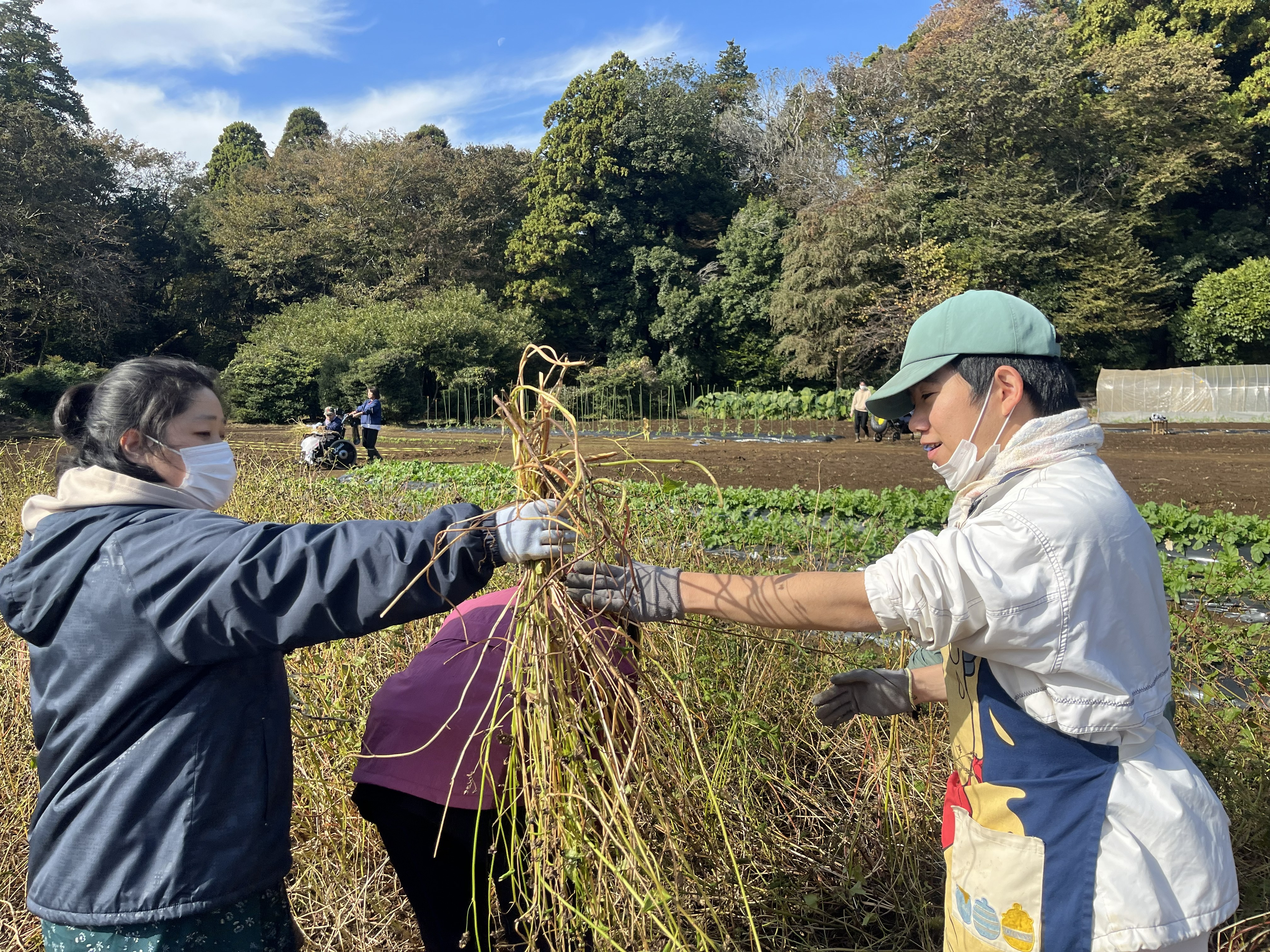 11月12日(水)に保護者を招いて共働作業日を行いました。今年は数年ぶりに栽培した蕎麦の収穫を行いました。天気も良く、絶好の収穫日和の中で蕎麦の刈り取りを行い、茎を結わいてハウスに干しました。