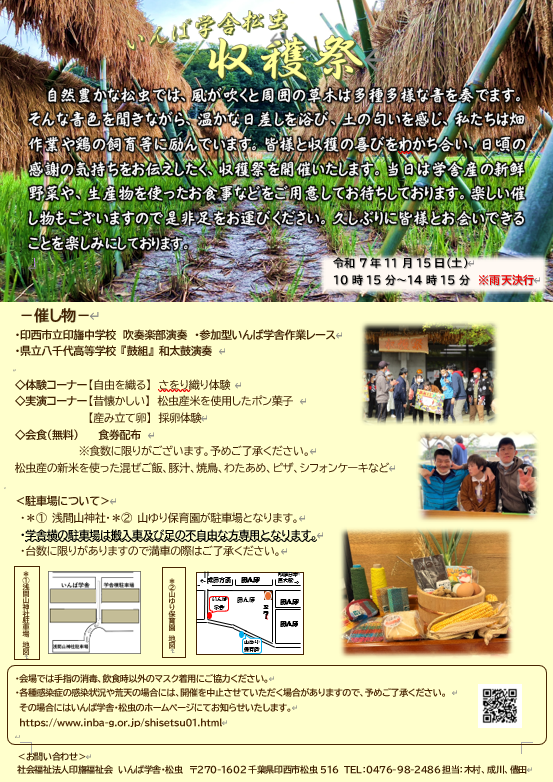 秋空の下、今年も収穫の喜びを皆様と分かち合いたく、いんば学舎・松虫の収穫祭を開催致します。