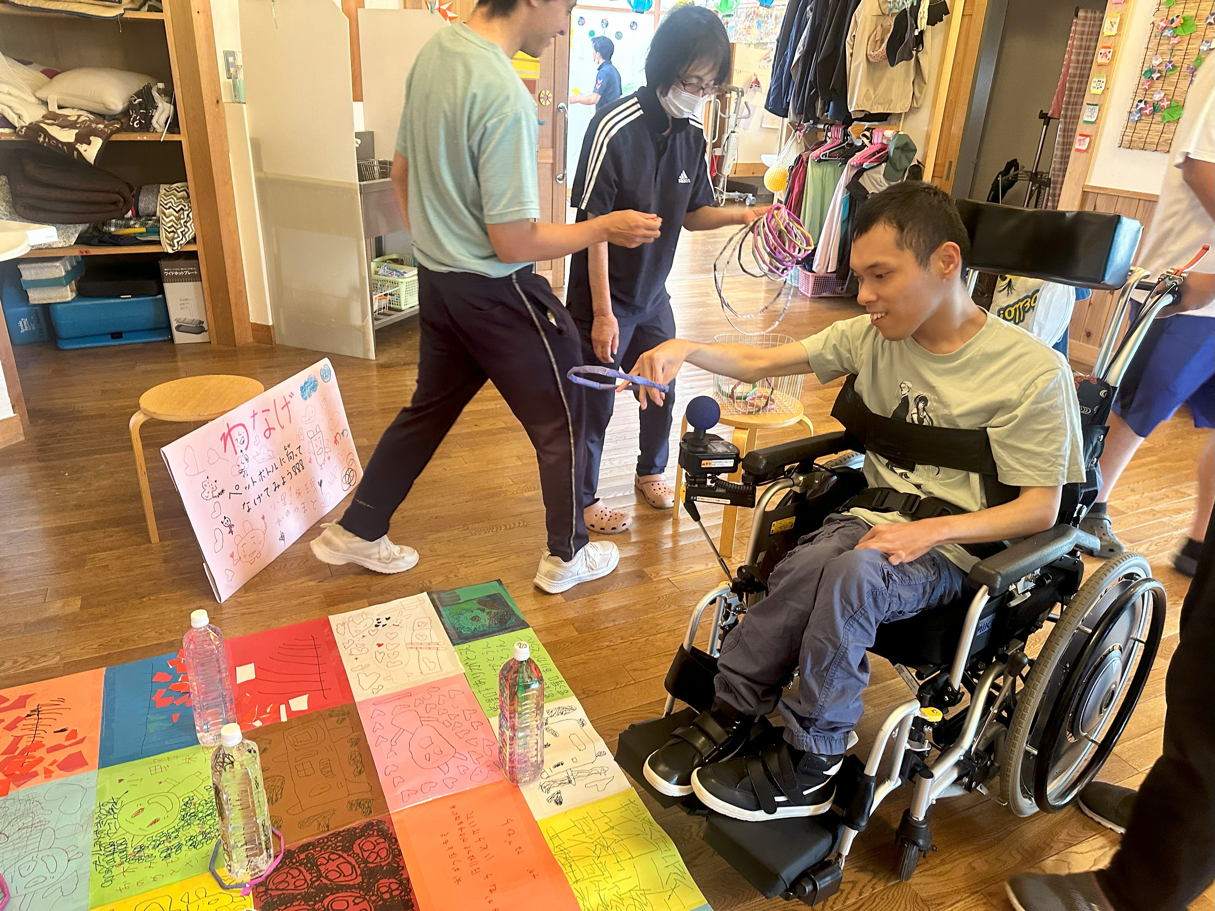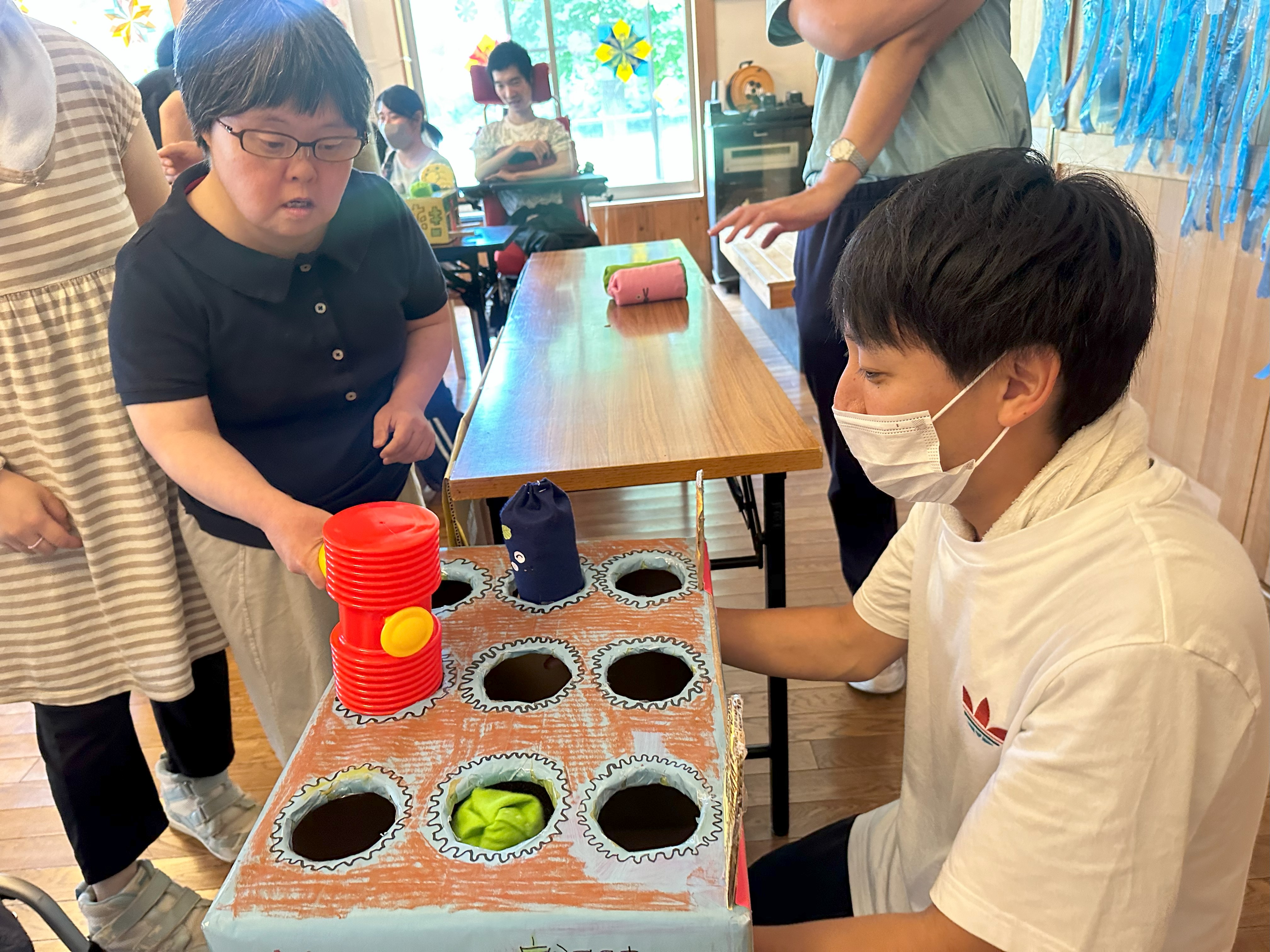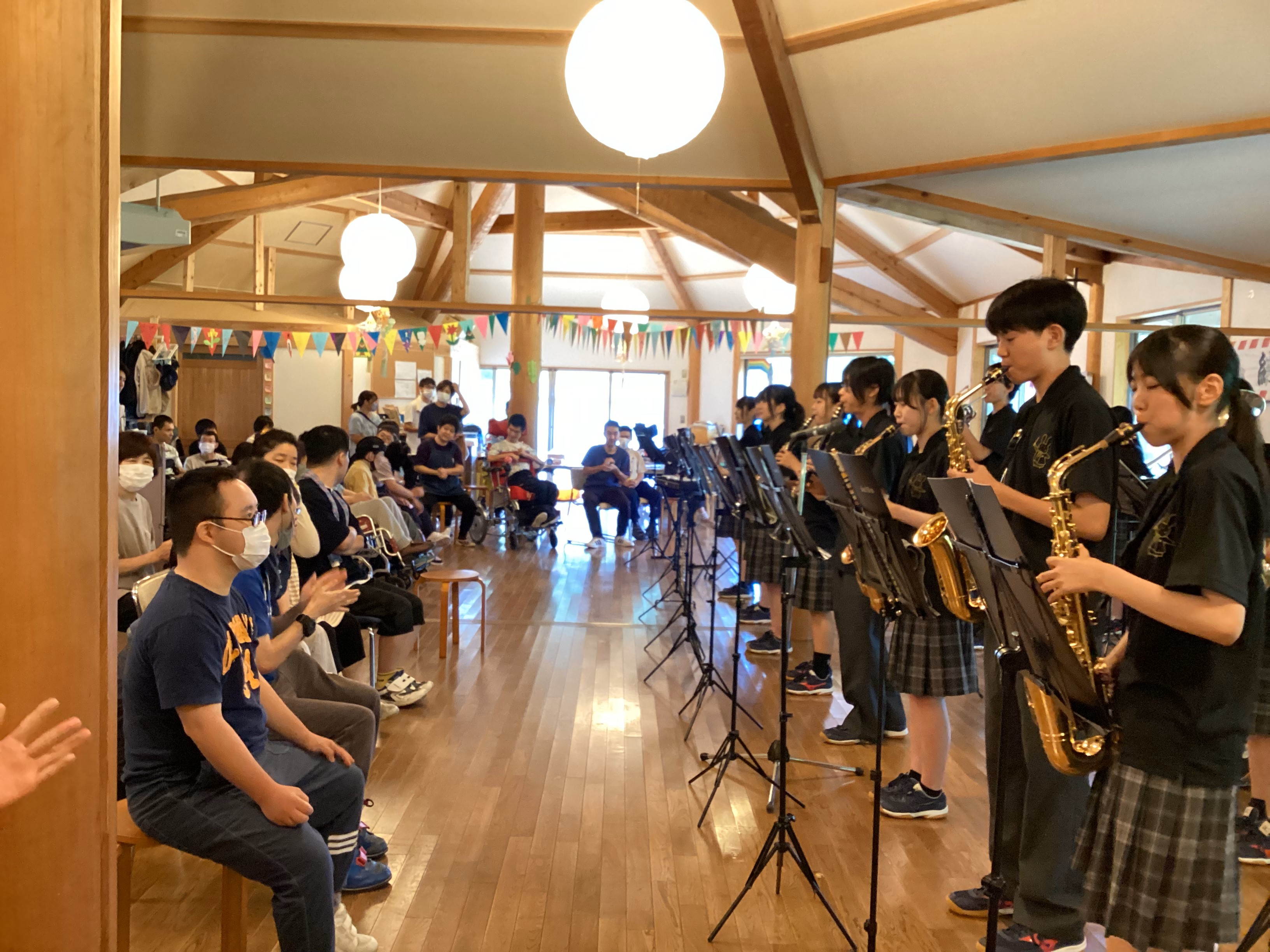 8月23日に納涼祭を開催しました。今年は千葉県立印旛明誠高校吹奏楽部の皆さんをお招きして、午前に演奏会を開催しました。メンバーは音楽に合わせて身体を揺らしたり、楽器を鳴らしたりして、楽しまれていました。午後は「金魚すくい」「射的」「もぐらたたき」などの縁日を楽しみました。最後はかき氷を作り、それぞれが選んだシロップをかけ、一日のことを振り返りながら食べていました。