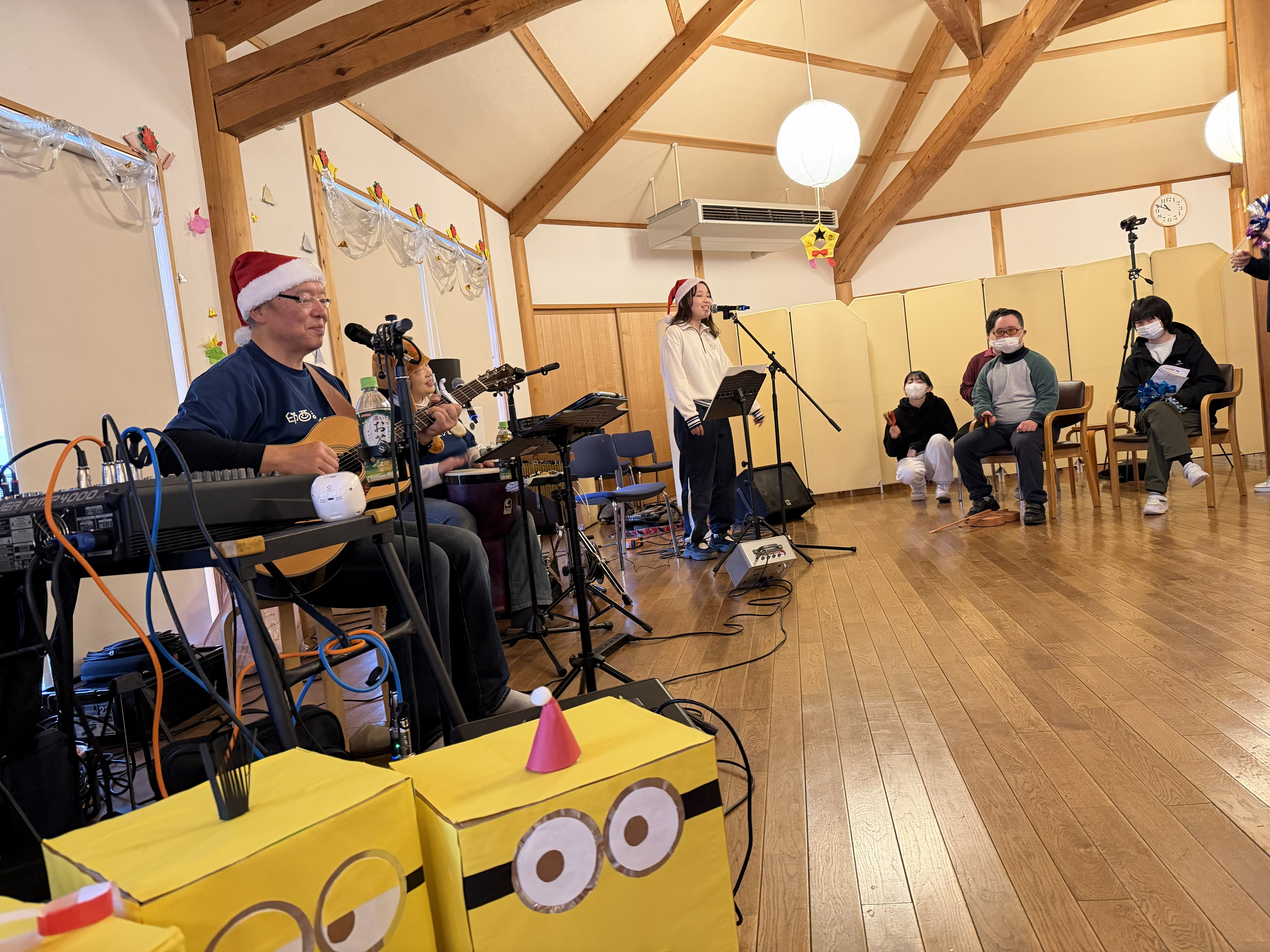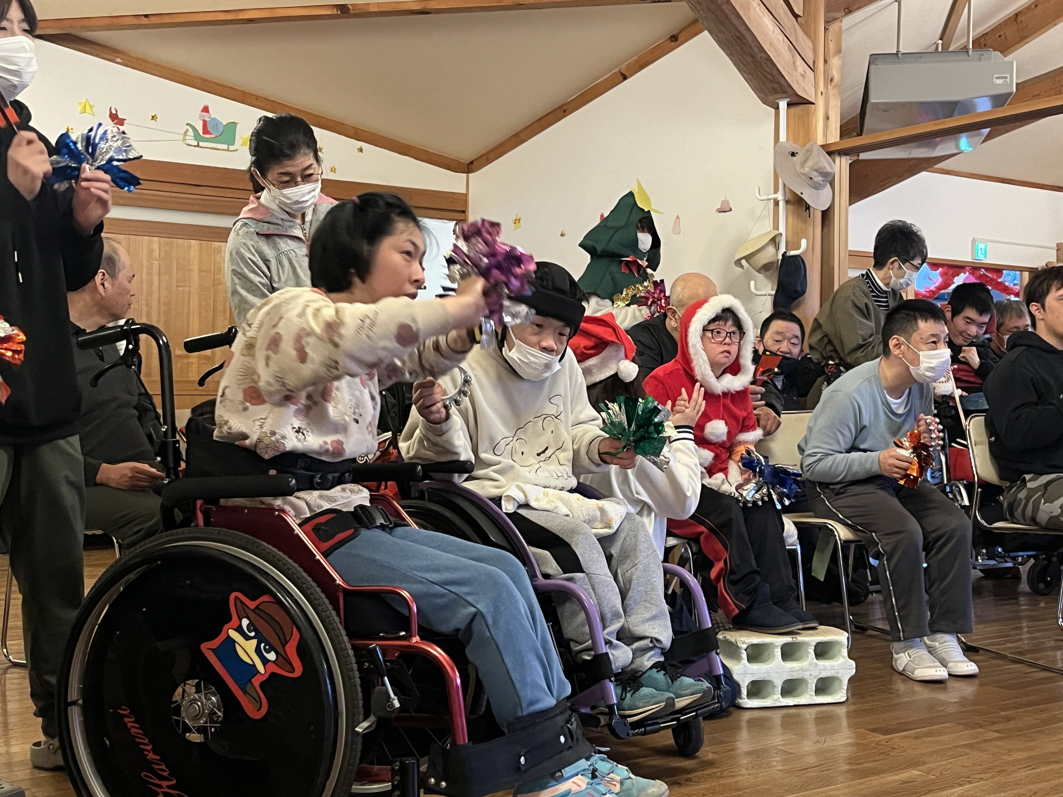 12月25日(木)に、今年もカラフルスタイルさんをお呼びしてクリスマスコンサートを行いました。クリスマスメドレーやマツケンサンバⅡが演奏されて、メンバーは楽器を鳴らしたり、歌ったりして楽しみました。