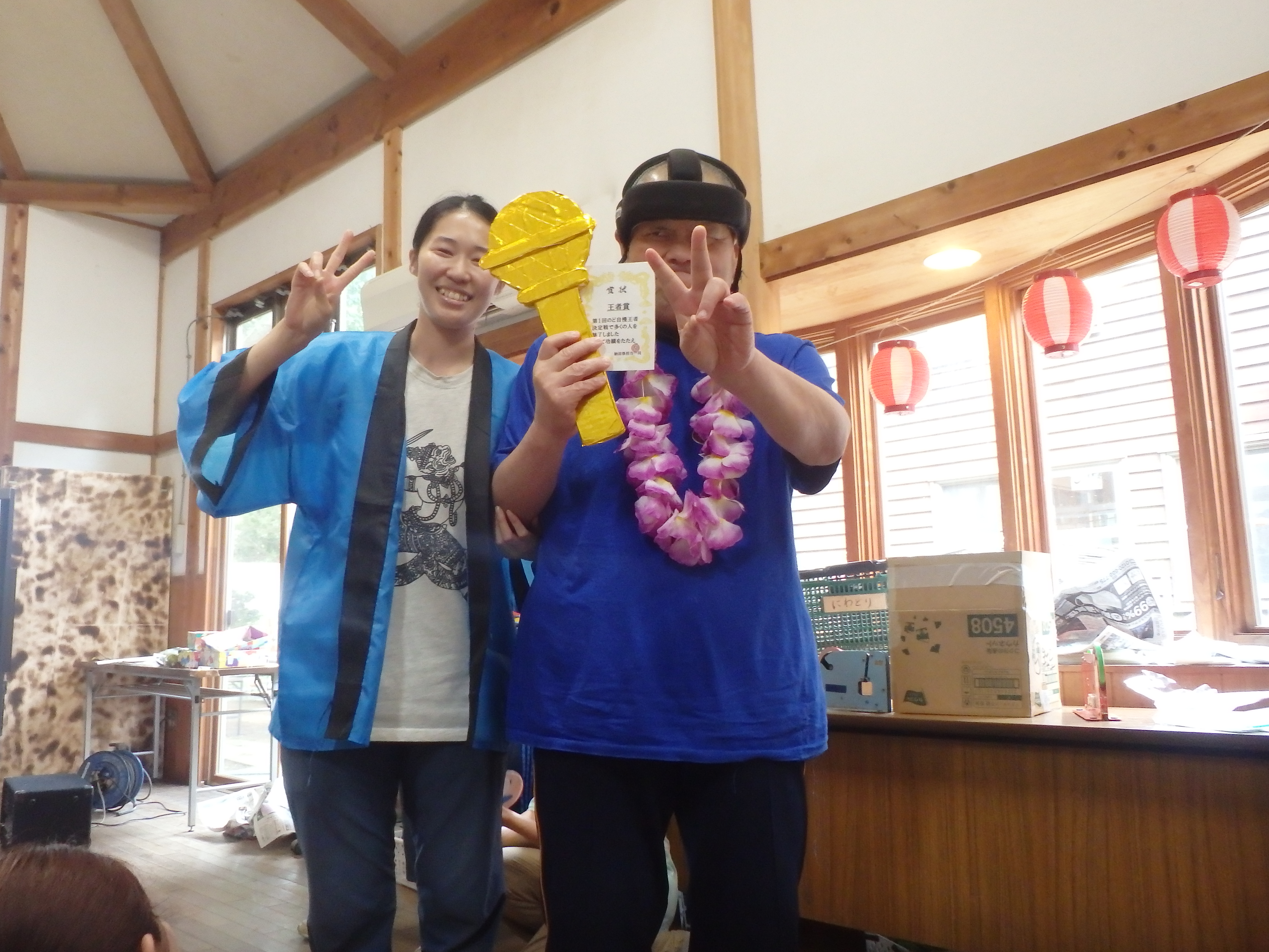 今年度の出し物は輪投げ、型抜き、虫取りゲーム、トマトすくい、ビンゴゲームの5つを実施し、また恒例のカラオケ大会は大盛り上がりで、今年はなんと各班から代表してのど自慢大会を実施しました。各班から選抜されたメンバーは気合が入り、第一回は陶芸班のメンバーが優勝しました。